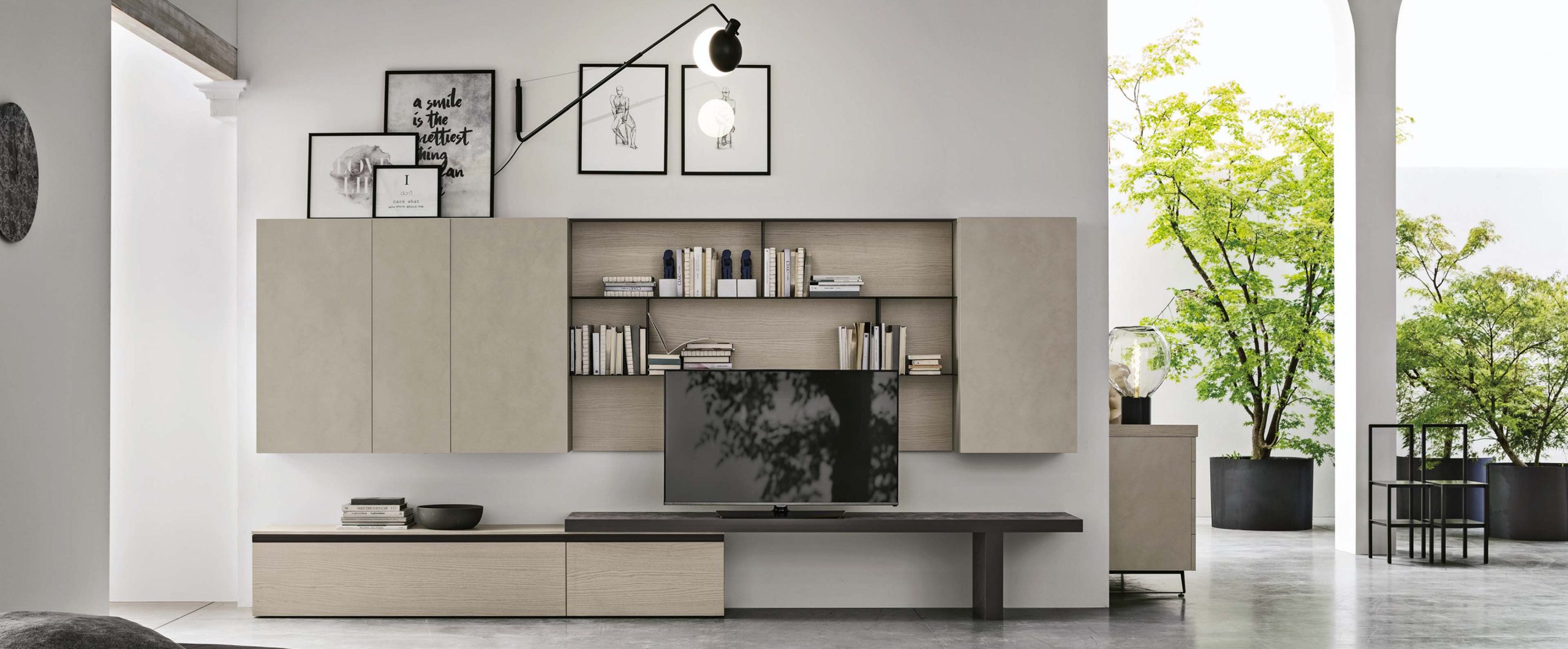 Composizione mobili per il soggiorno con finiture disponibili in diversi colori a seconda delle esigenze.