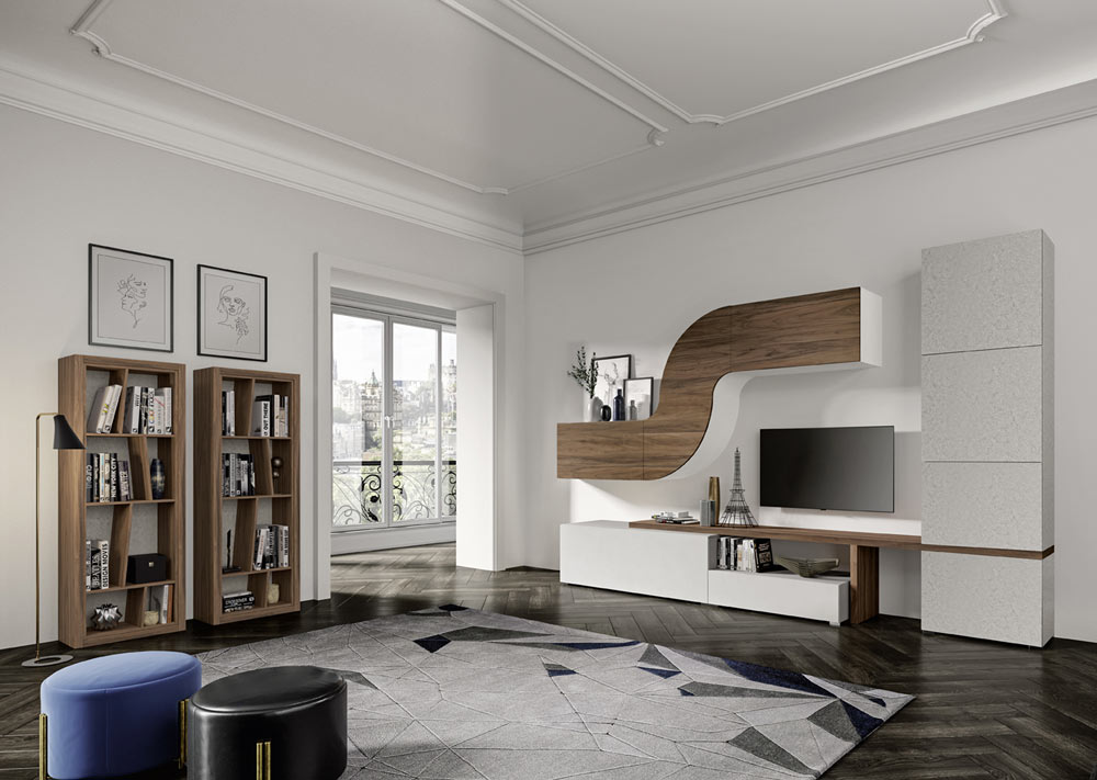 Parete attrezzata componibile con cassa in cemento bianco, frontali cemento bianco e noce Manhattan, top noce Manhattan, totem pietra grigio chiaro.